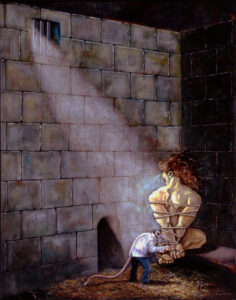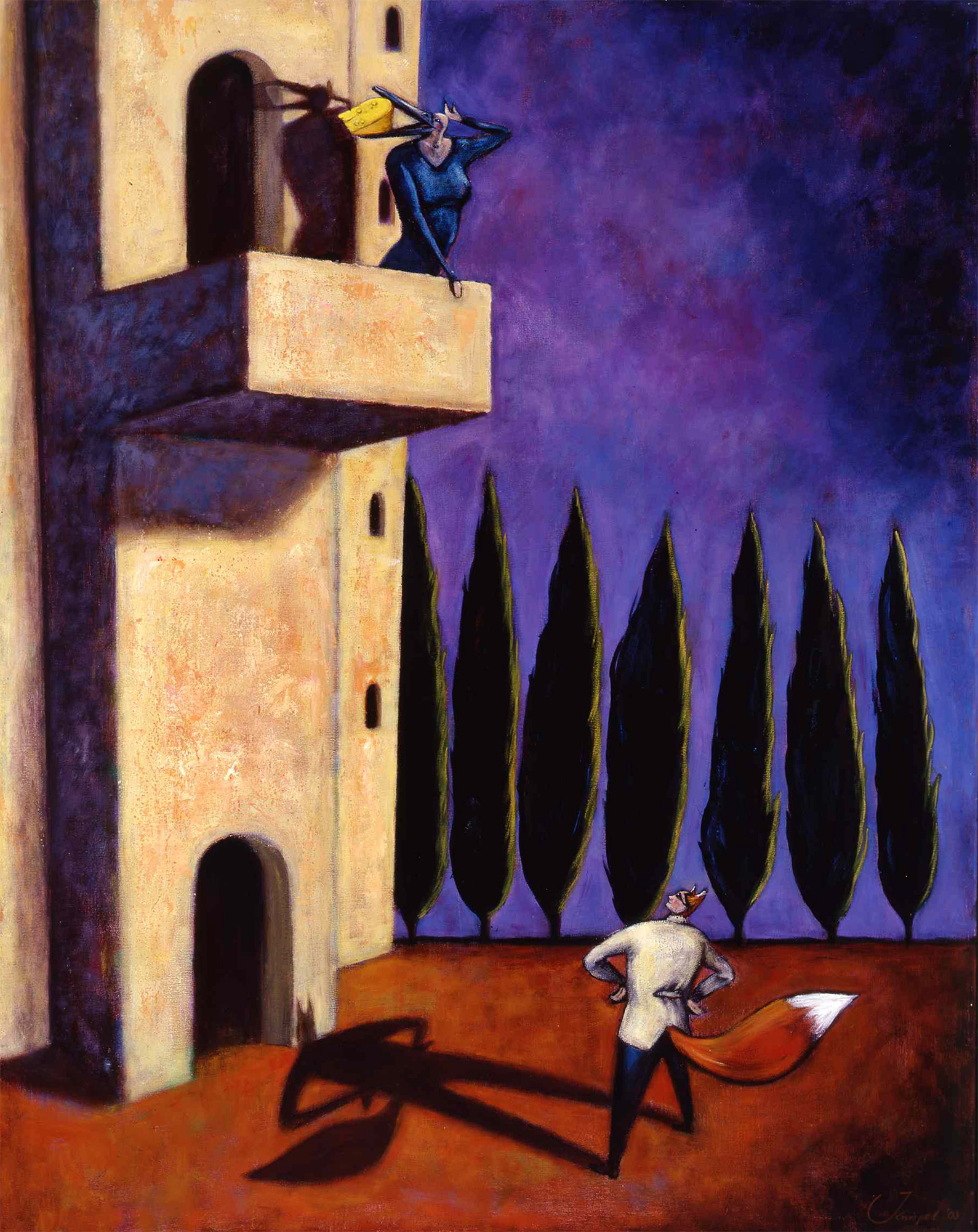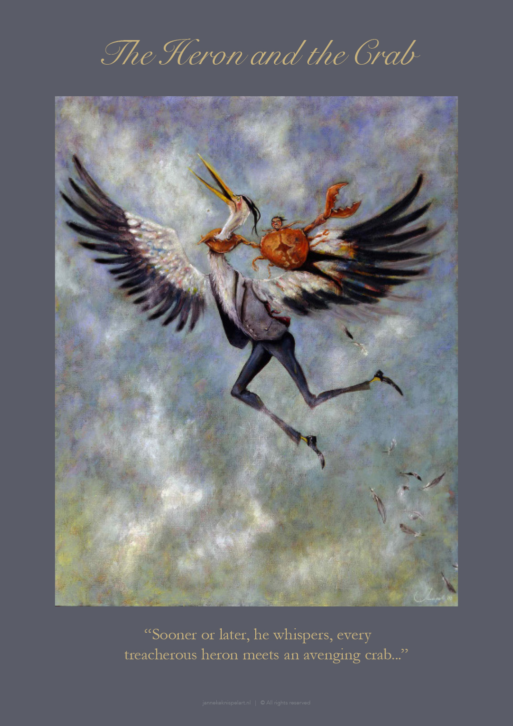 Op de schilderijen van Janneke Knispel is het een beetje anders. Je ziet niet zo zeer dieren, maar eerder mensen met dierlijke kenmerken. Het gaat bij de fabels immers niet om de dieren maar om het menselijke gedrag dat op de dieren wordt geprojecteerd.